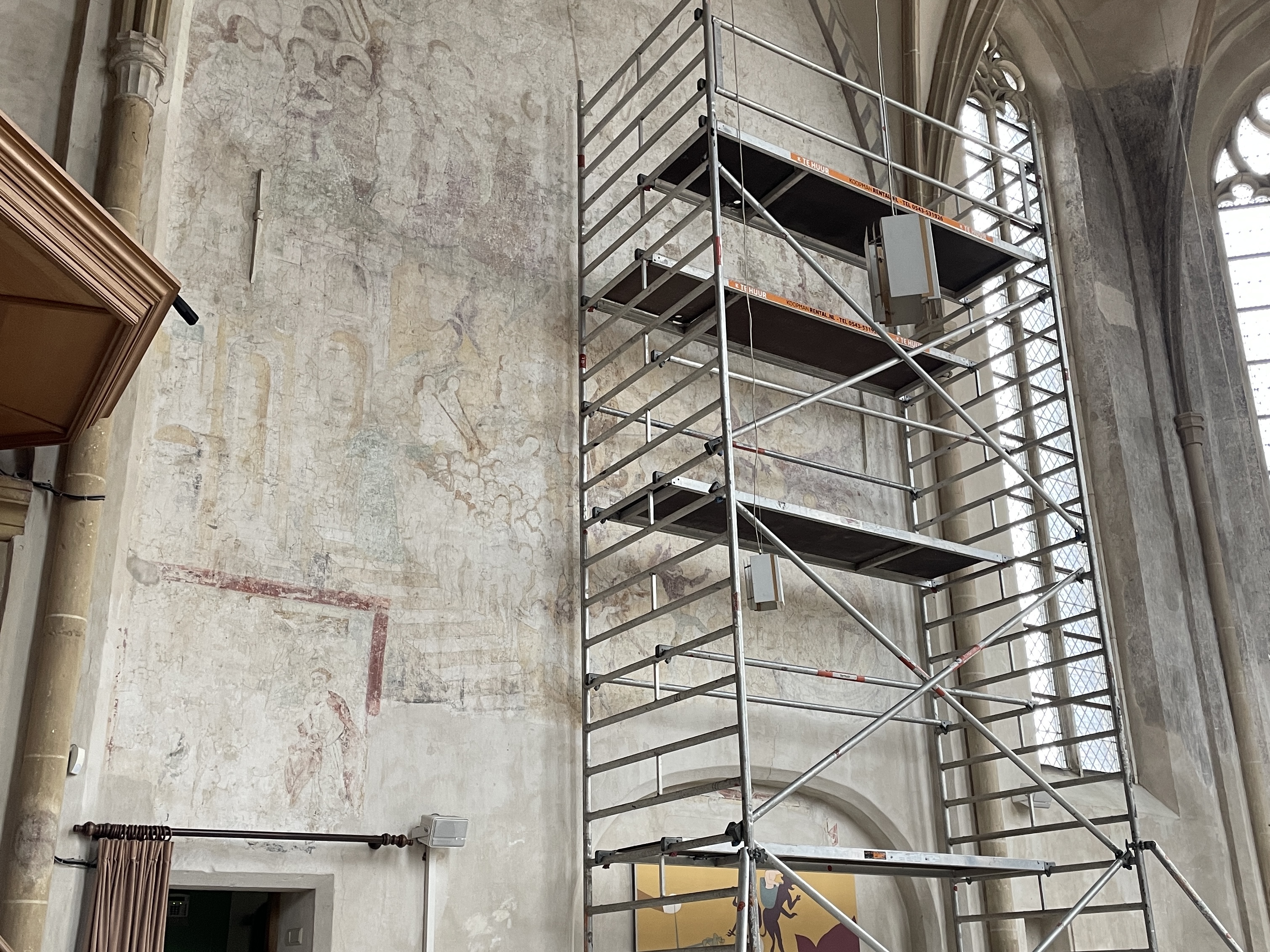 Noodconservatie van de muurschildering Het Laatste Oordeel in het koor.